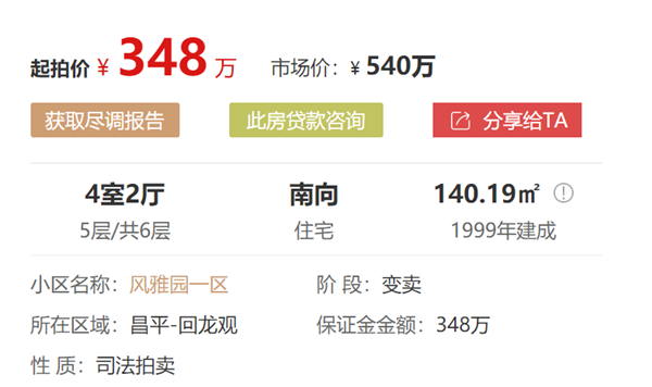 这是怎么回事呢?说的是昌平区风雅园小区的一套法拍房,全南向四居室,得房率高,距离地铁8号线育知路仅500米,南门出来就是奥特莱斯还有回龙观公园,北边紧邻积水潭医院,生活配套非常完善。