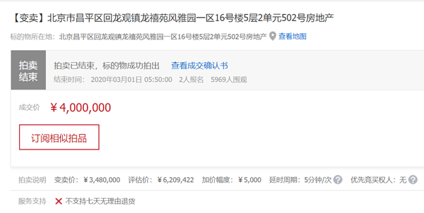 买家自己在家报名竞拍,两个多小时的竞价,最后400万成交,比二拍的保留价高了52万。