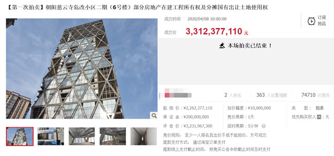 受中弘股份资金链危机爆发的影响,北京中弘大厦自2017年停工至今。4月7日上午10时,这个北京CBD地标建筑、中弘股份的明星项目首次网上拍卖引人关注,在拍卖平台围观人次超过6万。当天共有两人参拍,截至晚上10时,最终报价超26亿元,溢价3.4亿元。