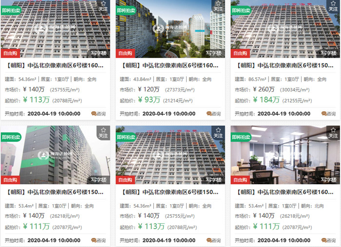 此外,开发商中弘旗下还有中弘北京像素6套写字楼拍卖,可以自由购,起拍价均在100万左右。