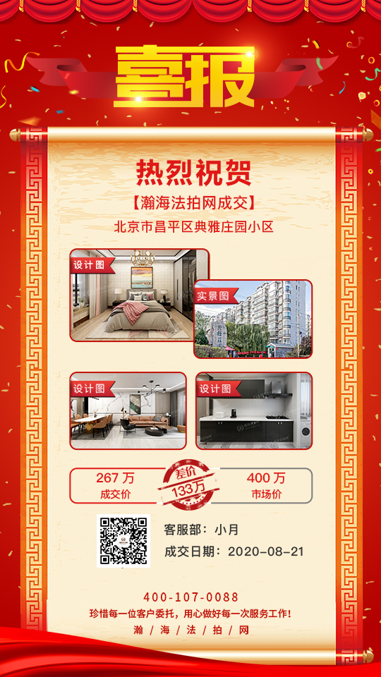 2020年8月21日,瀚海法拍网成功帮客户拍下昌平区典雅庄园小区的法拍房,成交价267万,对比目前房屋的市场价,节省了133万的购房成本!标的法拍房是昌平区典雅庄园4号楼的三居住宅,建筑面积124.85平米,标的起拍价267万,仅有1个人报名出价,零溢价抄底成交,相当于优惠价66折拍下。本次拍卖围观人数达22201人。
