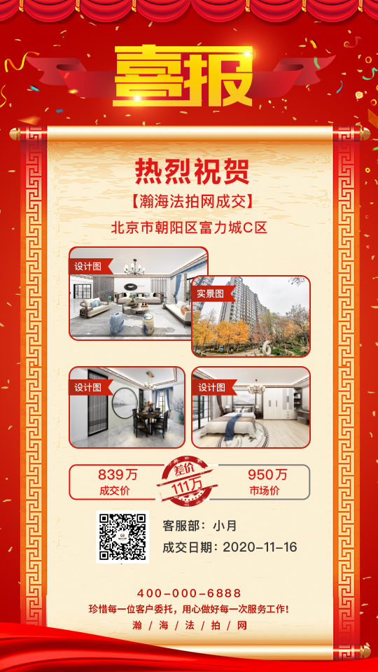 瀚海喜报 | 恭喜客户839万拍下朝阳富力城两居!