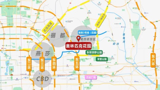 奥林匹克花园位于朝阳东坝片区,邻近国贸、亚运村、燕莎商圈,西距东三环12公里,北距首都机场20分钟车程。自2020年9月北京三大自贸片区揭牌,囊括东坝的金盏国际合作服务区成为北京市未来最具有发展潜力的地区之一。
