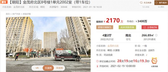 上拍标的为8号楼1单元2002室,带车位,面积266.89m²。起拍价2170万,市场价3400万,降价1230万、6.4折上拍。南北通透4室2厅,20层次顶层,采光好,视野佳。豪华装修,品质呈现。月租金6万左右,距开拍时间还有28天。“金粉”不可错过的置业良机。