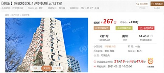 2月25日上拍的朝阳区核心区域呼家楼北街小区,降价163万,触底价267万上拍,刚需购房者难得的捡漏机会。拍卖标的为呼家楼北街13号楼3单元131室,2室1厅,61.45m²,起拍价267万,市场价430万,降价163万、6.2折上拍。南北通透采光好,主卧朝南,次卧和厨房朝北,户型合理,无面积浪费,纯板电梯房。