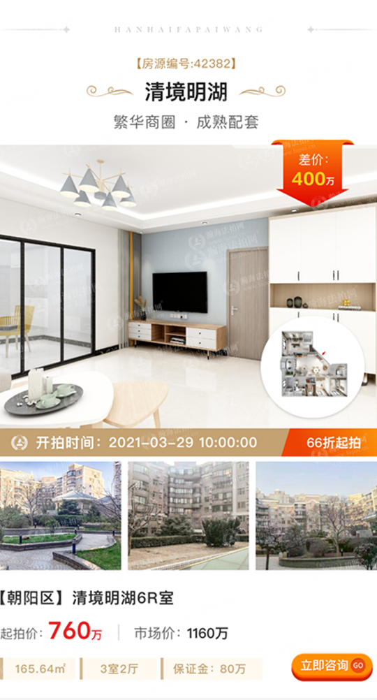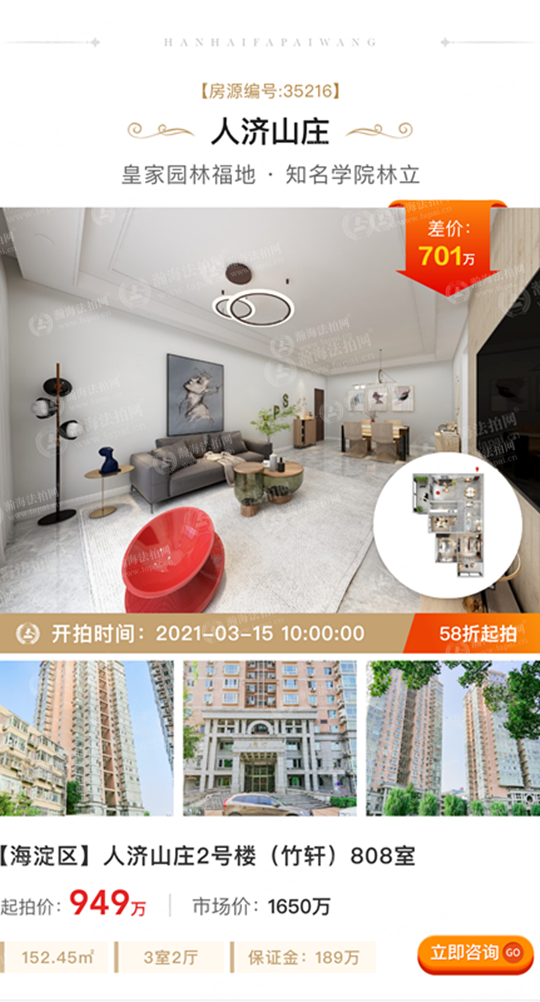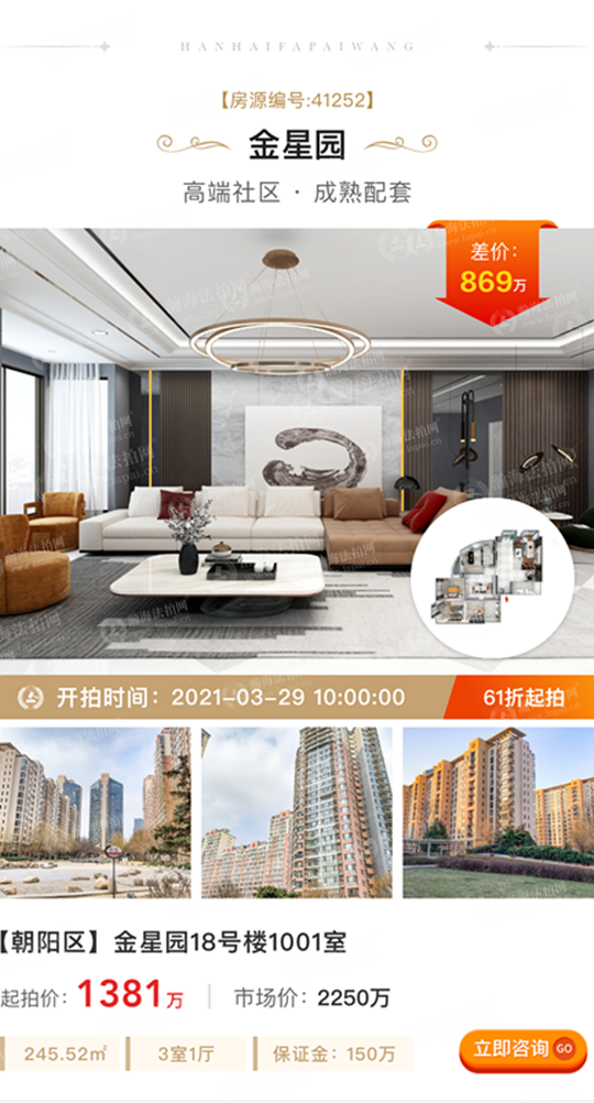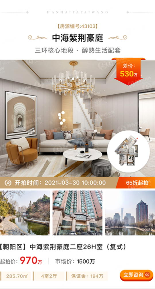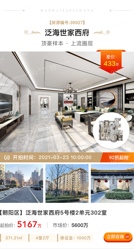①低折扣、差价大:拍卖标的起拍价1381万元,市场价2250万元,差价869万元,6.1折上拍。面积245.52㎡,3室1厅,西北朝向,月租金2.5万元左右。