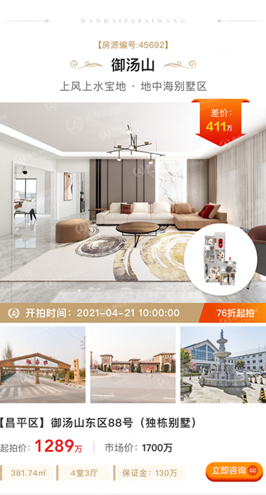 ①总价低,差价大:拍卖标的起拍价1289万元,市场价1700万元,差价411万元,7.6折上拍。面积381.74㎡,4室3厅,全向,独栋别墅,私密性好。