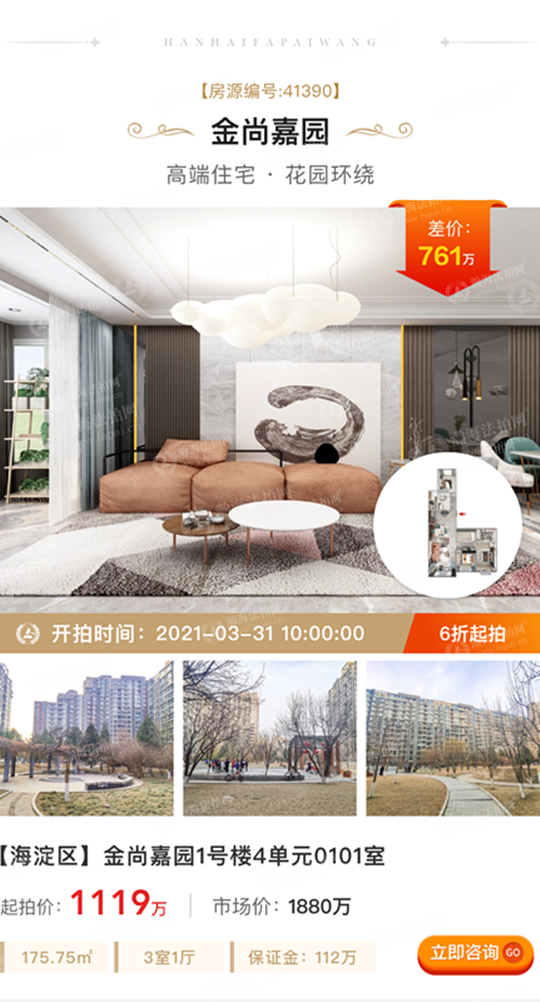 ①差价大,折扣低:拍卖标的起拍价1119万元,市场价1880万元,差价761万元,6折上拍。面积175.75㎡,3室1厅,南北通透,月租金1.8万元-1.9万元左右。