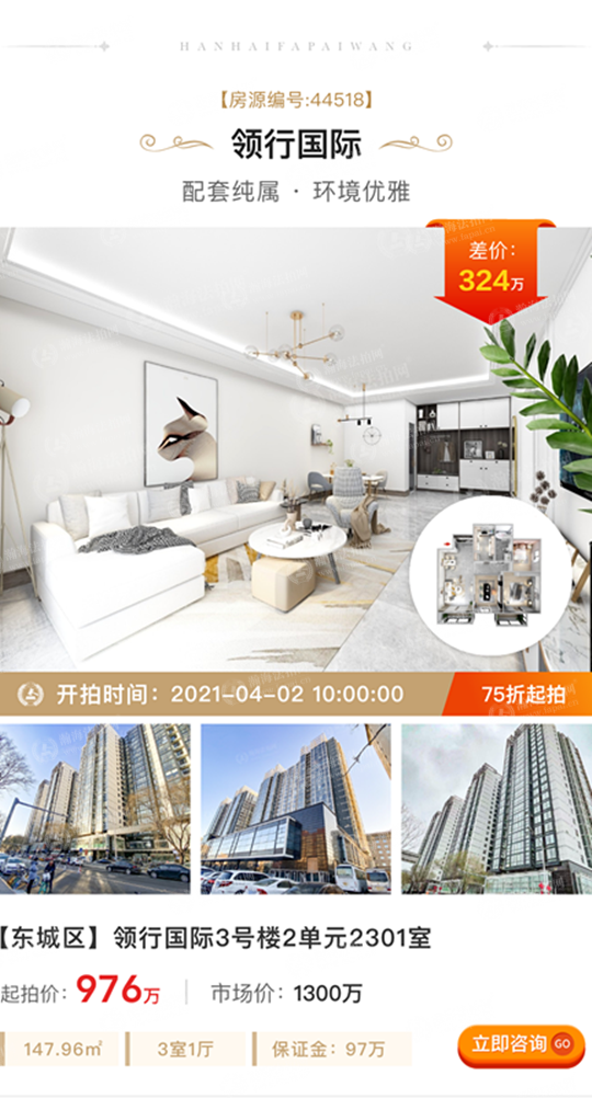 ①低总价、差价大:拍卖标的起拍价976万元,市场价1300万元,差价324万元,7.5折上拍。面积147.96㎡,3室1厅,东南朝向,23层高楼层,视野好。