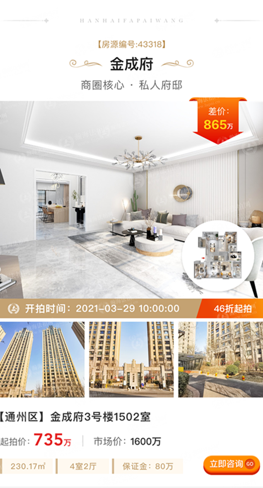 ①差价大,折扣低:拍卖标的起拍价735万元,市场价1600万元,差价865万元,4.6折上拍。面积230.17㎡,4室2厅,南北东朝向,月租金1.4万元左右。