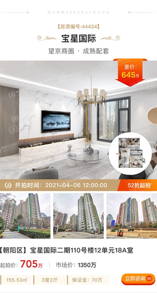 ①低折扣、低总价:拍卖标的起拍价705万元,市场价1350万元,差价645万元,5.2折上拍。面积155.53㎡,3室2厅,南北东朝向,位于18层黄金楼层,视野极佳,月租金1.5万元左右。