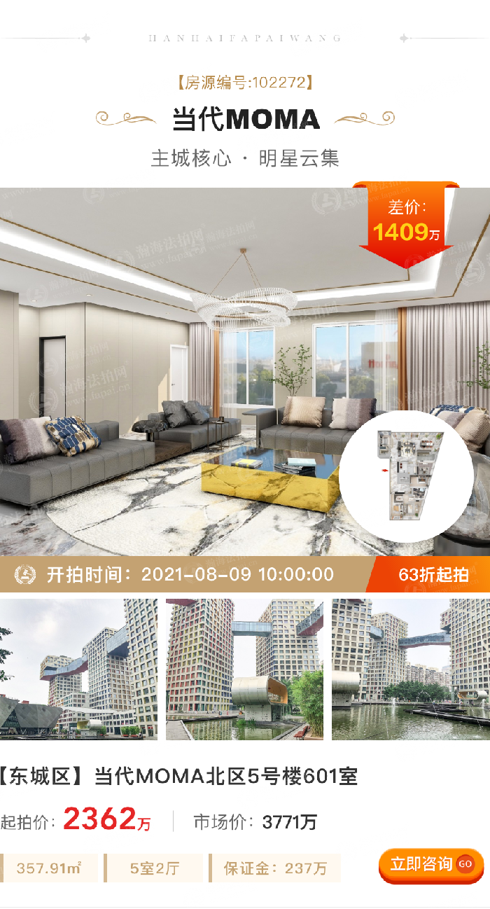 ③折扣低,差价大:拍卖标的起拍价2362万,市场价3771万,差价1409万,6.3折。357.91m²,5室2厅,6层,南北东朝向,2梯4户,月租金8万。
