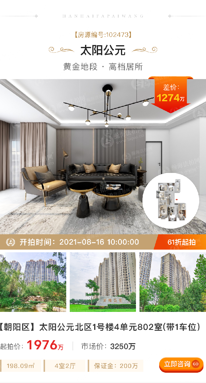 同时,7月31日,太阳公元南区2号楼3单元1001室(住宅)和太阳公元南区2号楼3单元1001室(商铺)同期上拍,有意向者可重点关注。