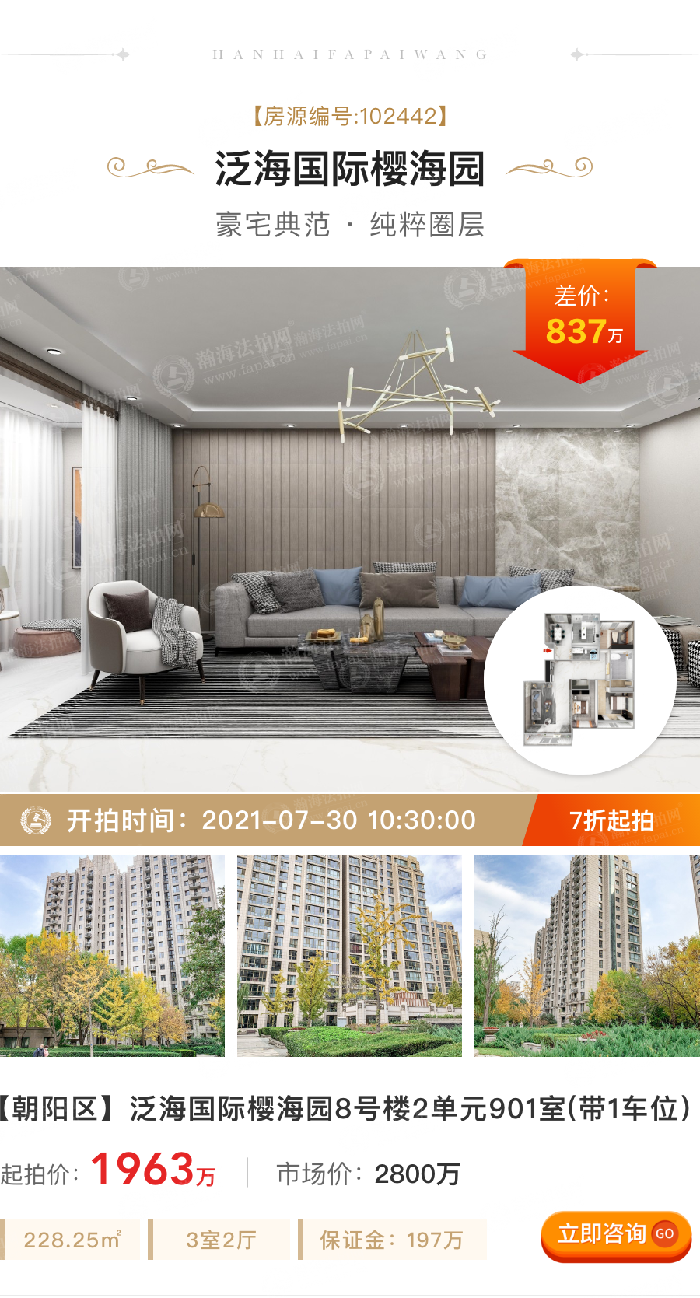 ③差价大,折扣低:拍卖标的起拍价1963万,市场价2800万,差价837万,7折。228.25m²,3室2厅,南北通透,9层,采光和视野好,2梯2户,月租金3.8万。