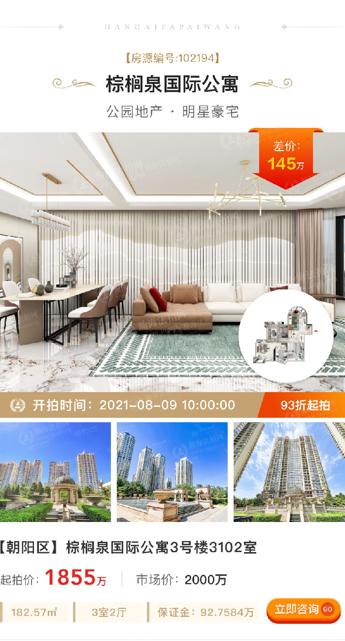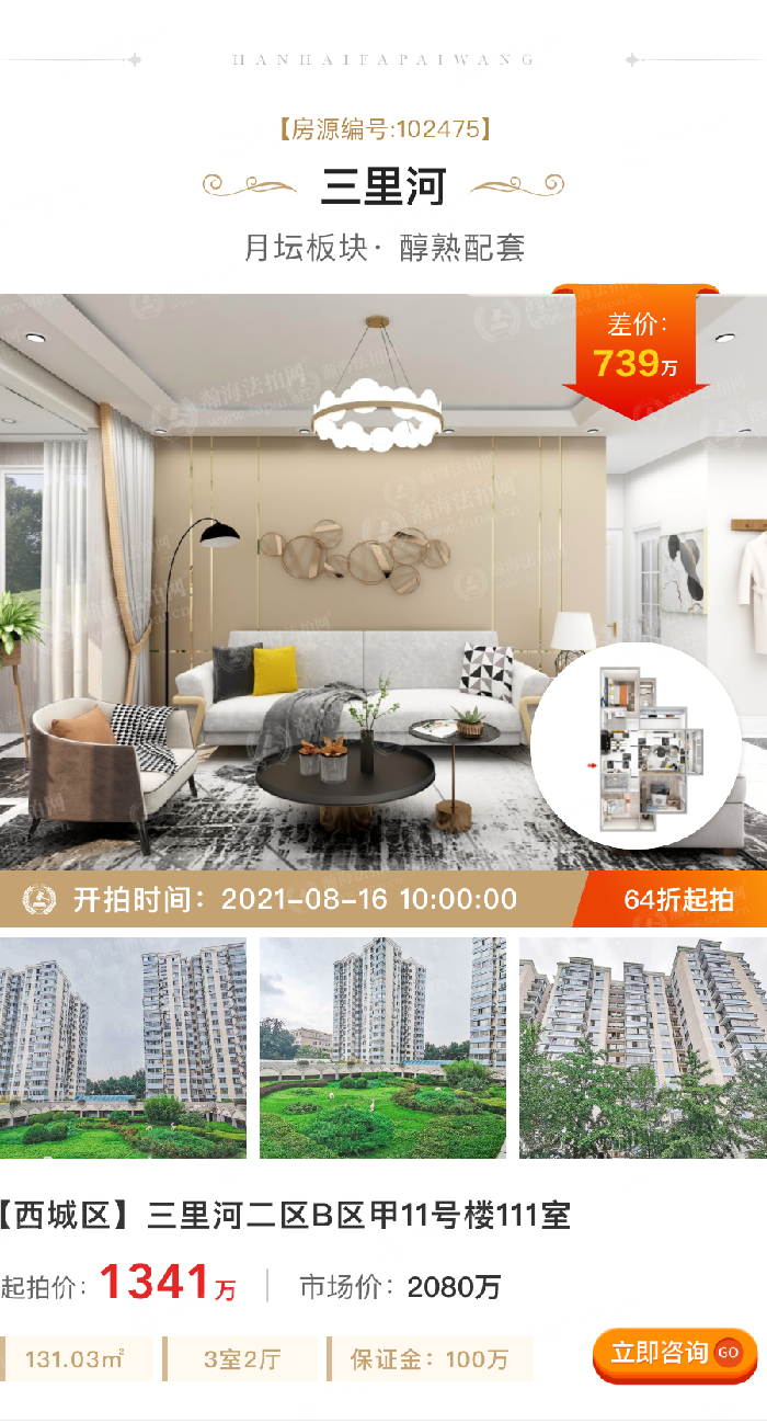 ③差价大、折扣低:拍卖标的起拍价1341万,市场价2080万,差价739万,6.4折。131.03m²,3室2厅,底层东向,2梯10户,月租金2万。