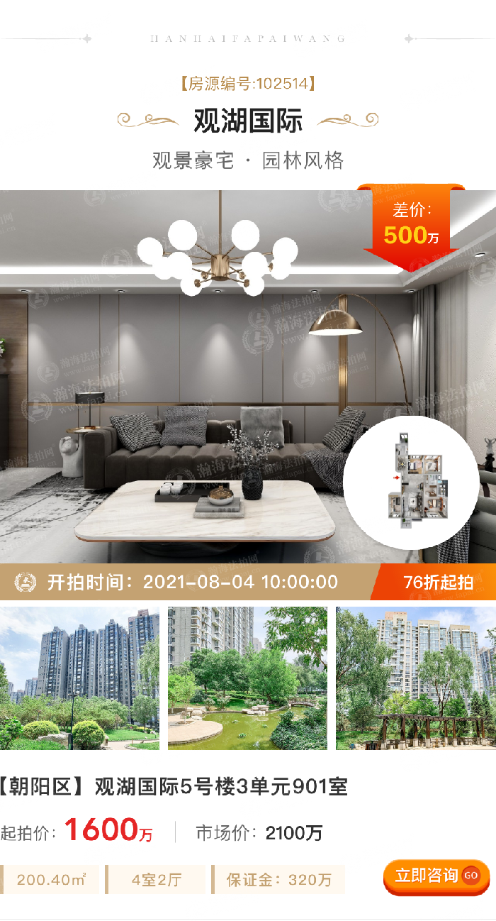 ③差价500万:拍卖标的起拍价1600万,市场价2100万,差价500万,7.6折。200.40m²,4室2厅,9层,南北通透,月租金3.3万。