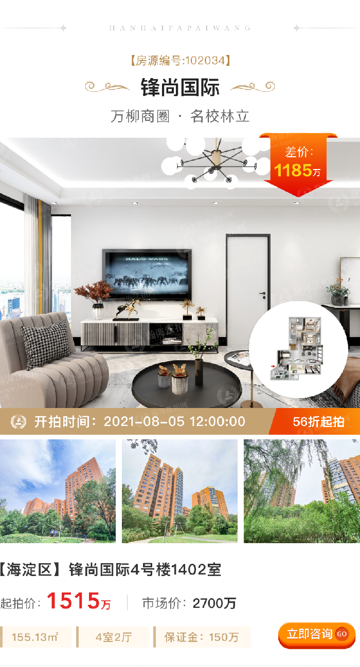 ③差价大,折扣低:小区是恒湿恒温高科技社区,拍卖标的起拍价1515万,市场价2700万,差价1185万,5.6折。155.13m²,4室2厅,14层,南北东朝向,月租金3.3万。