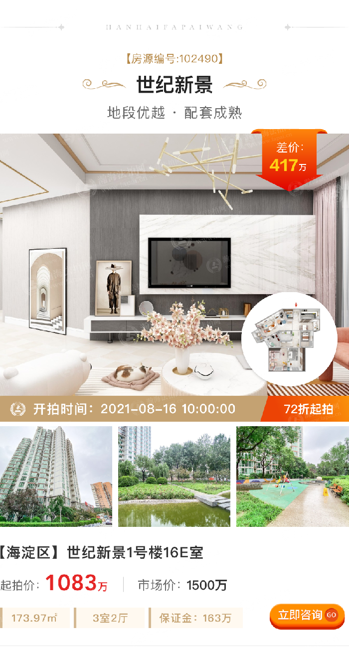 ③折扣低,差价大:拍卖标的起拍价1083万,市场价1500万,差价417万,7.2折。173.97m²,3室2厅,16层,西南朝向,3梯10户,月租金1.7万。