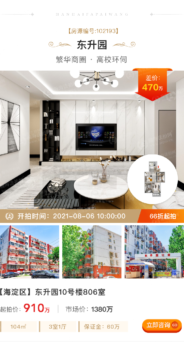 ③低总价,低折扣:标的起拍价910万,市场价1380万,差价470万,6.6折,104m²,3室1厅,南北西朝向,8层,采光和视野佳,2梯8户,月租金1.4万元。