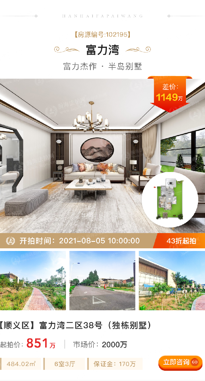 ③总价低、折扣低:拍卖标的起拍价851万,市场价2000万,差价1149万,4.3折。484.02m²,6室3厅,地下一层,地上三层,全向,月租金1.5万。