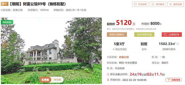 即将于2月20日10时上拍的【朝阳-财富公馆89号(独栋别墅)】起拍价5120万,市场价8000万,直降2880万,65折上拍。标的建面1502.33㎡,5室3厅,全向别墅,地上2层,地下1层,单价仅3.41万/㎡。