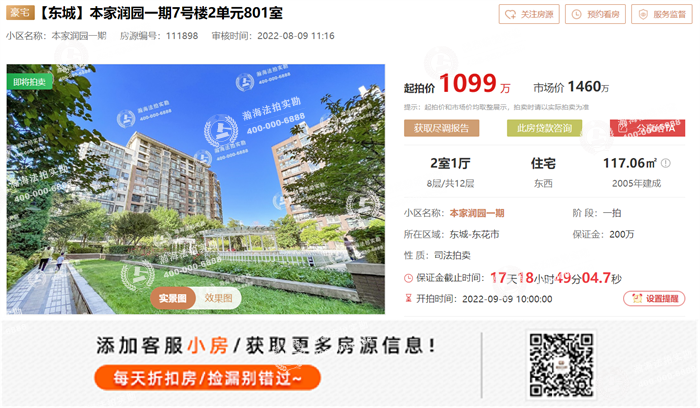 拍卖标的为【东城】本家润园一期7号楼2单元801室,市场价1460万,起拍价1099万,7.5折上拍,建面117.06㎡,2室1厅格局,东西南朝向,客厅卧室皆有阳台,可观景,楼总高12层,标的位于8层黄金楼层。月租金约1.5万。