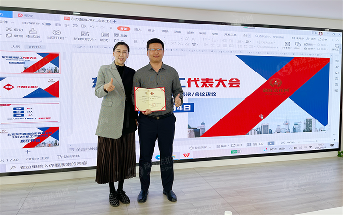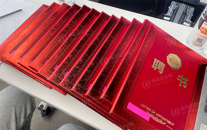 冯韶飞成功竞选为瀚海法拍网第二届职代会主席团的副主席,主席继续由关总担任,执行主席为乔炎女士。关总为职代会副主席颁布聘书。