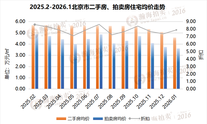 1月,拍卖房住宅平均成交单价3.61万/㎡,二手房住宅平均成交单价4.58万/㎡,拍卖房住宅成交折扣为7.88折成交。