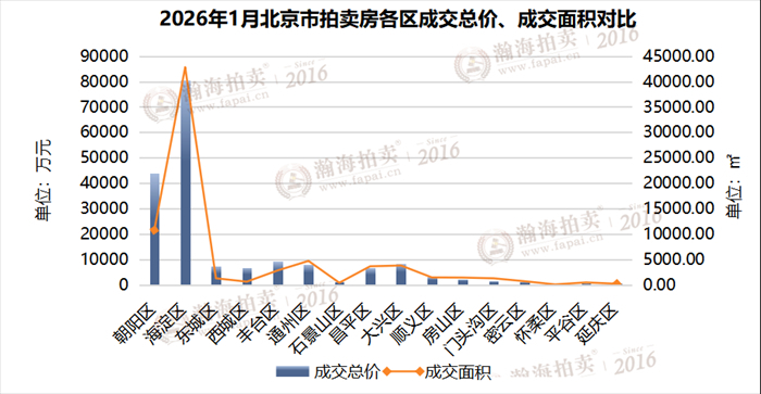1月,海淀区以成交总价80467.97万元,成交面积42812.14平方米,成为双项第一名;朝阳区以成交总价43942.1万元,成交面积10764.61平方米,成为双项第二名。