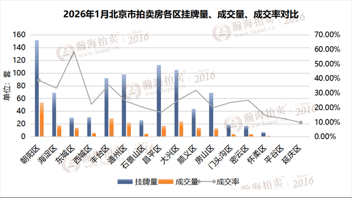 1月,东城区有效上拍24套,成交14套,成交率58.33%,排名第一;朝阳区有效上拍140套,成交54套,成交率38.57%,排名第二;丰台、海淀区、顺义区紧随其后,成交率都在30%以上。